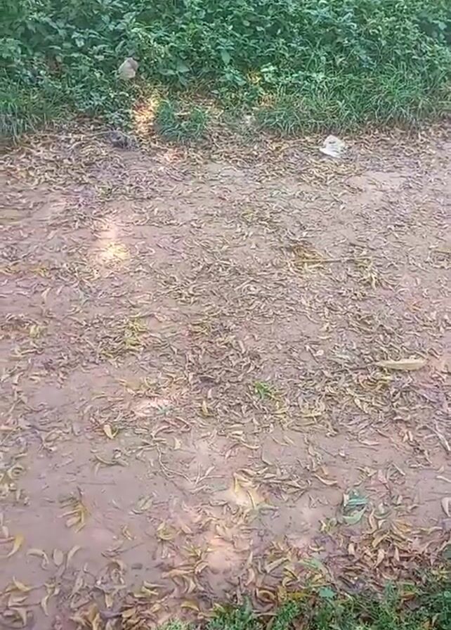 dirt path covered in leaves with green grass on either side. At the end of the path, four children wearing green uniforms walk towards the camera. One of the children is carrying a green ball. The background includes trees and buildings.