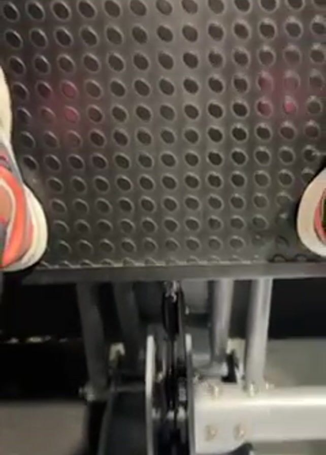 leg press machine in use, starting with a close-up of the footplate and a person's feet in sneakers