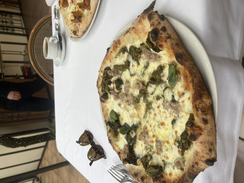 The image depicts a dining table within a restaurant located in Sorrento, Italy. The foreground is dominated by a round, Neapolitan-style pizza on a white plate, positioned centrally on a white tablecloth. This pizza features a charred, bubbly crust, a base of melted white cheese, interspersed green leafy vegetables, and light brown crumbled sausage. To the left of the pizza, a silver fork is visible. Above the fork, a pair of brown tortoiseshell sunglasses rests on the tablecloth. In the mid-ground, a second, partially visible pizza with orange-red toppings is present on another white plate. Further back, a white espresso cup containing dark liquid sits on a matching saucer with a small spoon. A wicker-backed chair is partially visible behind the espresso cup. The background reveals a tiled floor, dark decorative metalwork, and the lower torso and legs of a person, dressed in dark attire, walking from left to right.