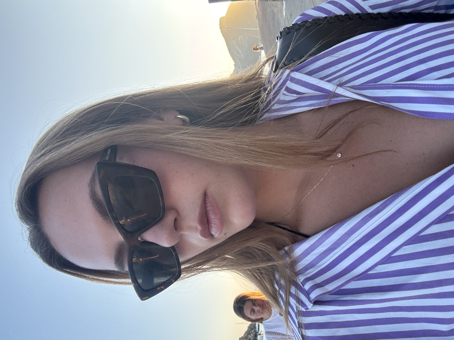 The image depicts a close-up, slightly low-angle perspective of a female subject, likely captured during the golden hour in Sant Elm, Spain. **Main Subject:** A fair-skinned female, appearing to be in her twenties or thirties, occupies the majority of the foreground. She has light brown or blonde hair, parted on the left, falling over her shoulders. Her eyes are obscured by dark, cat-eye style sunglasses with tortoise-shell frames, bearing the visible "SAINT LAURENT" branding on the right temple. Her lips are visible, appearing full with a light color. She wears a light purple and white vertically striped collared shirt, unbuttoned to reveal a black garment, possibly a bikini top, and a delicate silver-colored chain necklace with a small, singular clear pendant or diamond. A small, silver-colored hoop earring is visible in her right ear. Part of a dark, possibly black, woven or braided shoulder bag is visible on her right side. **Secondary Subjects and Background:** To the left of the main subject, partially out of focus, another female with blonde hair and a white, possibly lace, top is visible. She appears to be looking down or away. In the mid-ground, a white boat with a visible mast is moored on calm water. The distant background features rocky, arid terrain or mountains, illuminated by the low, warm light of the setting sun, which casts a bright glow on the horizon and mountain peaks. The overall sky is a clear, light blue, transitioning to warmer tones near the horizon. The ground appears to be rocky or unpaved, consistent with a coastal or harbor area.