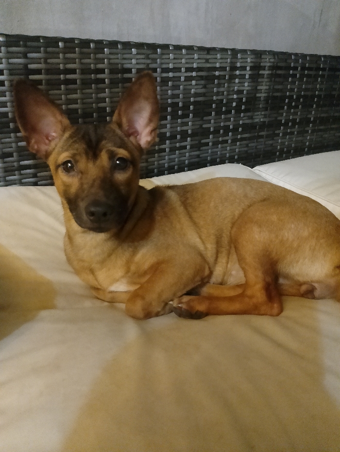 A domestic canine, predominantly tan with dark brown markings on its muzzle, periocular regions, and dorsal skull, is depicted in a recumbent position on a light-colored, upholstered surface. The animal's large, erect, pointed ears are prominent, and its dark eyes are directed forward. Its front limbs are tucked beneath its torso. In the background, a dark grey, woven synthetic material or rattan-style furniture piece, likely a headboard or chair back, is visible against a plain light grey wall. This scene is situated in Nha Trang, Vietnam.