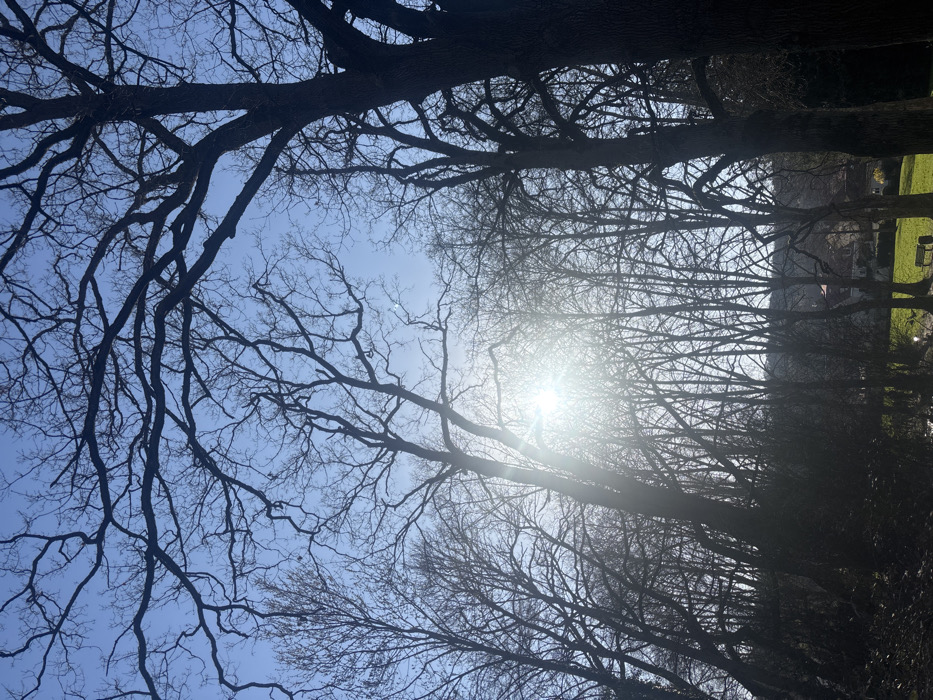 The image captures an outdoor scene within a park or wooded area in Saint-Rémy-lès-Chevreuse, France. The upper half of the frame displays a clear, light blue sky. Numerous bare deciduous trees, devoid of leaves, dominate the composition, their branches forming a dense silhouette against the sky, indicative of winter or early spring. A prominent lens flare, originating from the sun, is visible in the upper-left quadrant, indicating strong backlighting. The lower portion of the image shows the ground, with areas of bright green grass visible in the mid-ground to the right. A single, empty park bench is situated on the grass beneath a tree in the mid-ground. Distant structures, likely residential buildings, are partially visible through the tree line in the background. No individuals, animals, or observable actions or interactions are present in the scene.