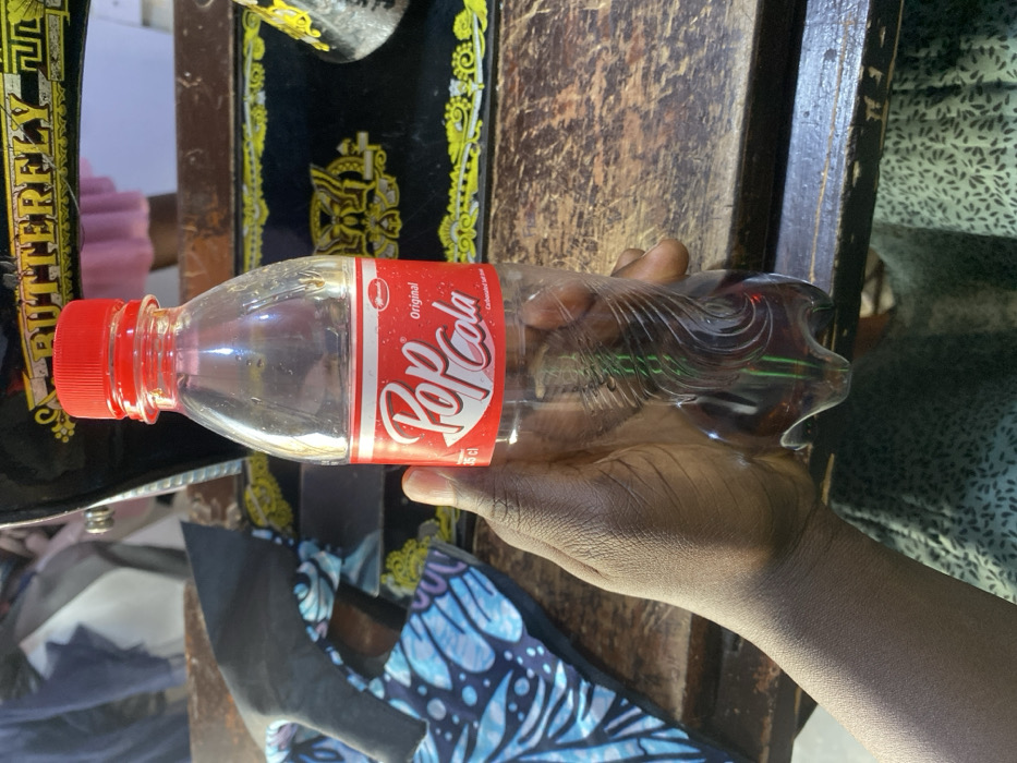 - "A dark-skinned hand grasps a partially consumed 35cl plastic bottle of "Pop Cola Original," featuring a red screw-top cap and a red label with white text" by FM-SQJvT2, licensed under CC BY 4.0