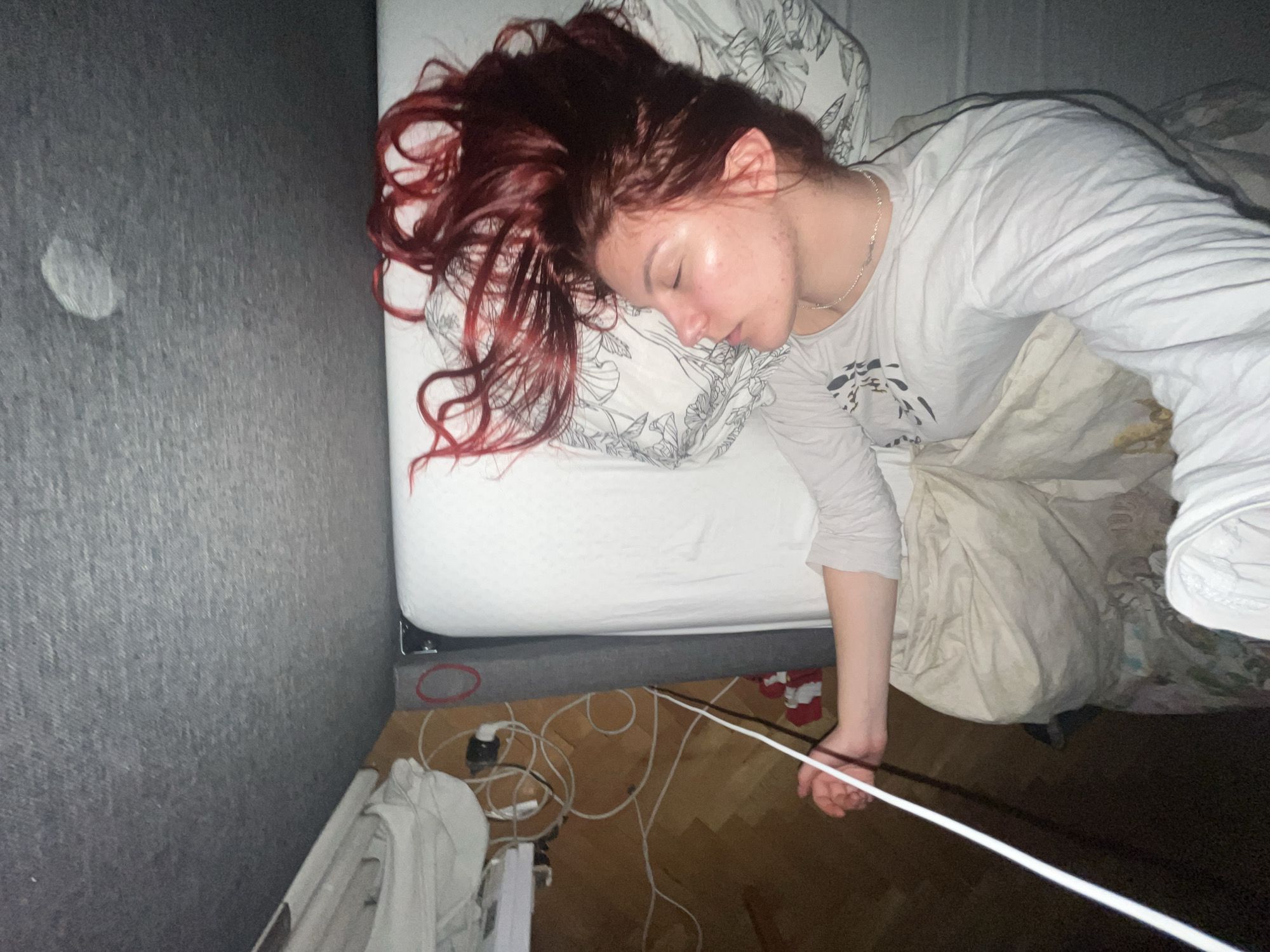 A person with long, dyed red hair is sleeping on a bed with a patterned pillow and white bedding. They are wearing a light-colored, long-sleeved shirt and a silver chain necklace. The bed is next to a grey wall. The floor is wooden and has electrical cords and a charging cable tangled on it, along with some partially visible items under the bed. No specific location in Sofia, Bulgaria is discernible from the image.
