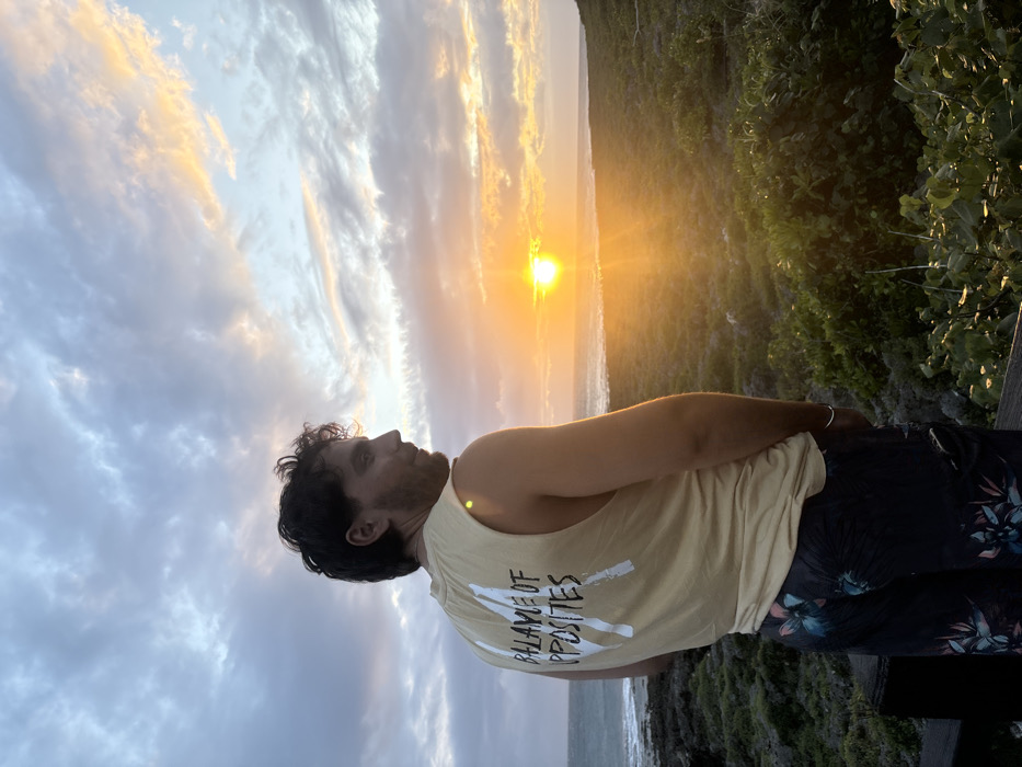 A male subject is positioned with his back partially to the viewer, looking towards the setting sun on a vegetated coastal bluff in Hengchun, Taiwan
