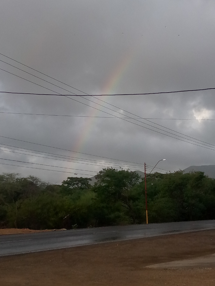 A rainbow appears faintly in the overcast sky over a rural scene. A road runs horizontally across the foreground. Green trees cover the middle ground. Utility poles and wires stretch across the scene. A mountain range is visible in the distance under the cloudy sky.
