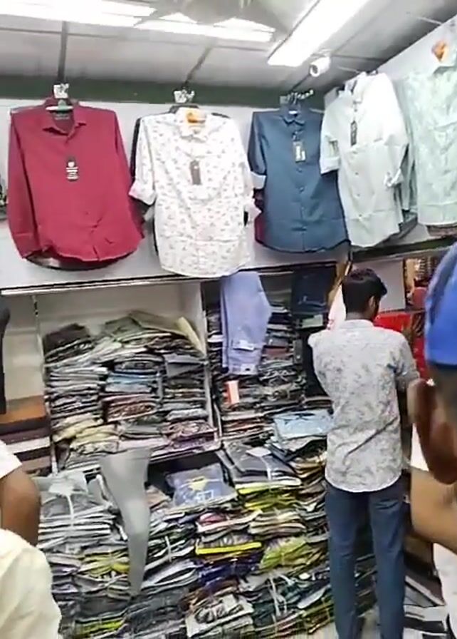 n indoor setting in a clothing store. Garments, including shirts and jeans, are displayed on shelves and hangers. Several individuals are present, presumably customers and store staff, interacting with the merchandise and each other. The environment is brightly lit with overhead fluorescent lights.