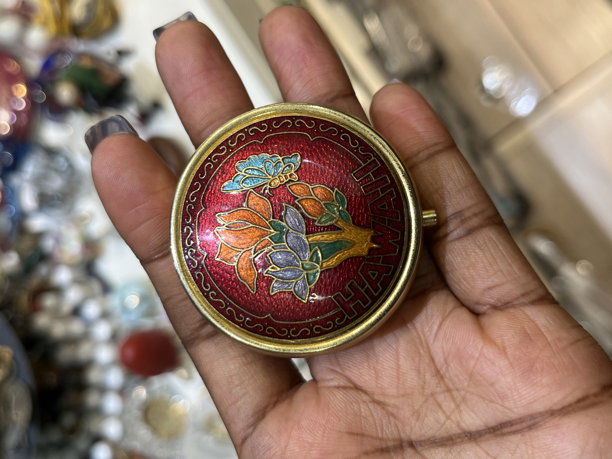 A person's hand holds a round, decorative object with a red background and a floral design featuring a butterfly. The object has a gold-colored rim and appears to have the word "Hanoi" written around the edge. The hand is positioned against a blurred background of jewelry and display cases, suggesting the setting is a jewelry store or market. The person has dark skin and grey fingernails.