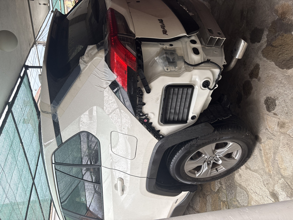 Location: City of Unknown, Unknown. The scene depicts the rear-right side of a white Toyota RAV4 SUV in a state of partial disassembly, parked on a wet, irregular stone-paved surface under a green mesh shade net. The vehicle's rear bumper is completely removed, exposing the silver metal bumper beam, a chrome exhaust pipe, and various wires and mounting points. The right rear quarter panel shows exposed black plastic internal brackets and a black louvered vent. The right taillight assembly is intact and visible. White adhesive tape is applied around the upper rear window and spoiler area of the vehicle. Water droplets are visible on the vehicle's surface and the ground, which shows several puddles and damp areas. A spherical white light fixture hangs from the overhead structure. No individuals are present in the image.