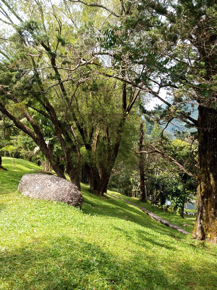 The image depicts a static, outdoor natural environment located in Unknown, India. The foreground consists of a sloping terrain covered in short, vibrant green grass, illuminated by sunlight that casts distinct shadows. A large, grey, irregular-shaped boulder is situated on the grassy slope towards the left. In the midground, a dense assortment of trees with varying trunk thicknesses and foliage densities is present. A cluster of trees with multiple slender trunks and lush green leaves stands on the left. A narrow, unpaved path or track descends gently towards the right, partially obscured by shadows and foliage. A thick, moss-covered tree trunk is visible on the far right. The background reveals distant, vegetated hills or mountains through gaps in the tree canopy, under a bright sky. No individuals, actions, or interactions are visible within the scene.
