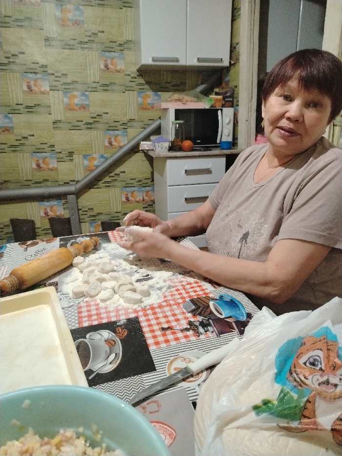In a kitchen located in the city of Дойная, Russia, an adult female with short, dark hair, wearing a light tan t-shirt with a dandelion graphic, is seated at a table. She is actively engaged in preparing food, specifically shaping small, flour-dusted pieces of dough with her hands. Numerous similar dough pieces are spread across a flour-covered section of the patterned tablecloth, which features red and white checkerboard and coffee-themed designs. A wooden rolling pin and a white-handled knife are present on the table, alongside a partially visible light blue bowl containing a filling mixture. A plastic bag with a tiger graphic rests on the right side of the table. The kitchen background includes patterned wallpaper depicting desert scenes, white wall-mounted cabinets, a white microwave oven, and a white three-drawer cabinet. An orange fruit and a glass jar are visible on the counter beside the microwave. A metallic bar extends diagonally in the upper left of the scene.