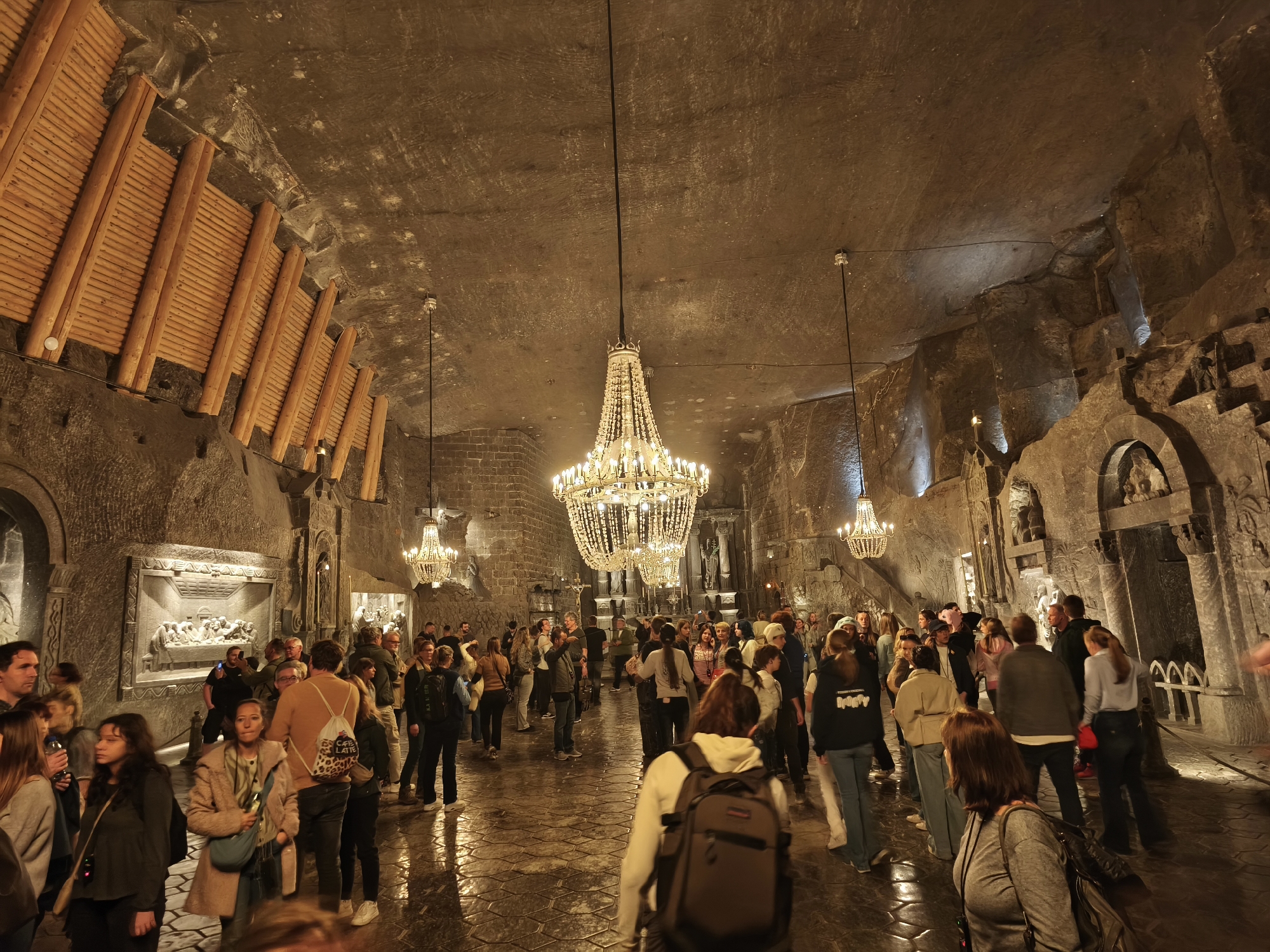 The image depicts a large group of people inside the Wieliczka Salt Mine in Wieliczka, Poland