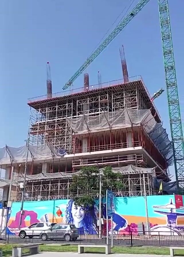 construction site in Santiago, Chile. A multi-story building is under construction, with scaffolding and cranes visible. A mural is displayed on a fence in front of the construction site. A fountain is also in the foreground, with traffic moving along the street. The sky is blue and clear.