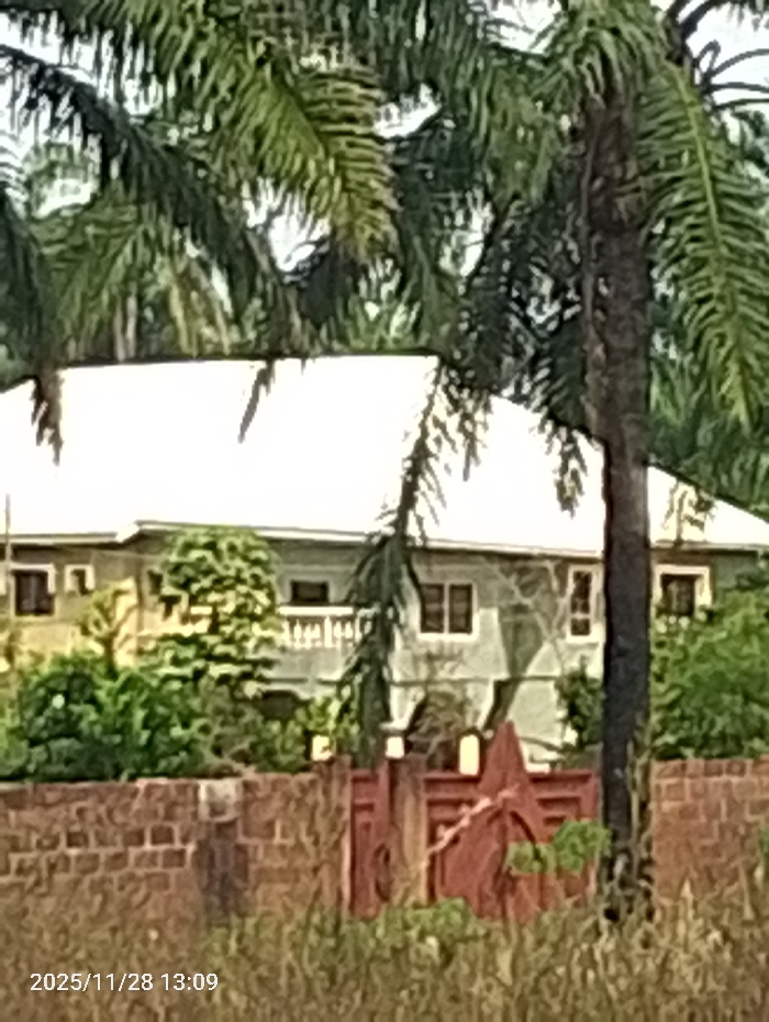 The image displays a two-story residential structure in Sanioko, Nigeria, partially obscured by vegetation and a perimeter wall