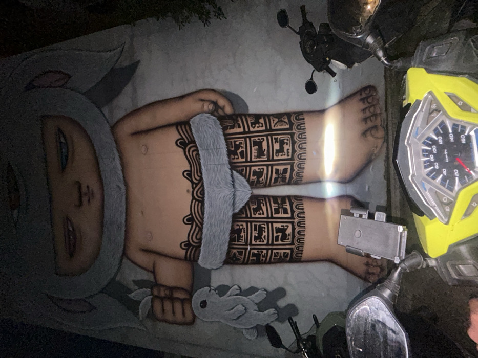 The image displays a large-scale wall mural at night in the town of Pai, Thailand, observed from the perspective of a parked motorcycle. The central subject of the mural is an anthropomorphic, stylized figure resembling a child or youth, depicted from the mid-chest downwards. This figure wears a light-grey, hooded garment with animal-like ears and a fluffy collar. Its face features large, distinctively colored eyes (one reddish, one bluish) and a small third eye or emblem on its forehead. The torso is bare, revealing nipples, while a light-grey, fluffy loincloth covers the pelvic area. The legs are adorned with intricate, dark, repeating geometric and animal motifs, resembling tribal patterns or tattoos. The figure holds a small sprig of leaves in its left hand. To the figure's left, a smaller, light-grey, rabbit-like creature with large ears stands upright on the mural, casting a shadow. In the immediate foreground, two motorcycles are parked, partially obscuring the lower section of the mural. The leftmost motorcycle's handlebars, a dark-colored phone mount, and its yellow and grey dashboard with a speedometer (showing markings up to 180 km/h) are clearly visible. The rightmost motorcycle's front wheel and part of its body are visible. Bright light reflections, likely from the motorcycles' headlights or a camera flash, illuminate the lower half of the mural, particularly the figure's feet. Dark foliage is visible on the far right edge of the frame, behind the right motorcycle. The overall lighting suggests a nighttime setting.