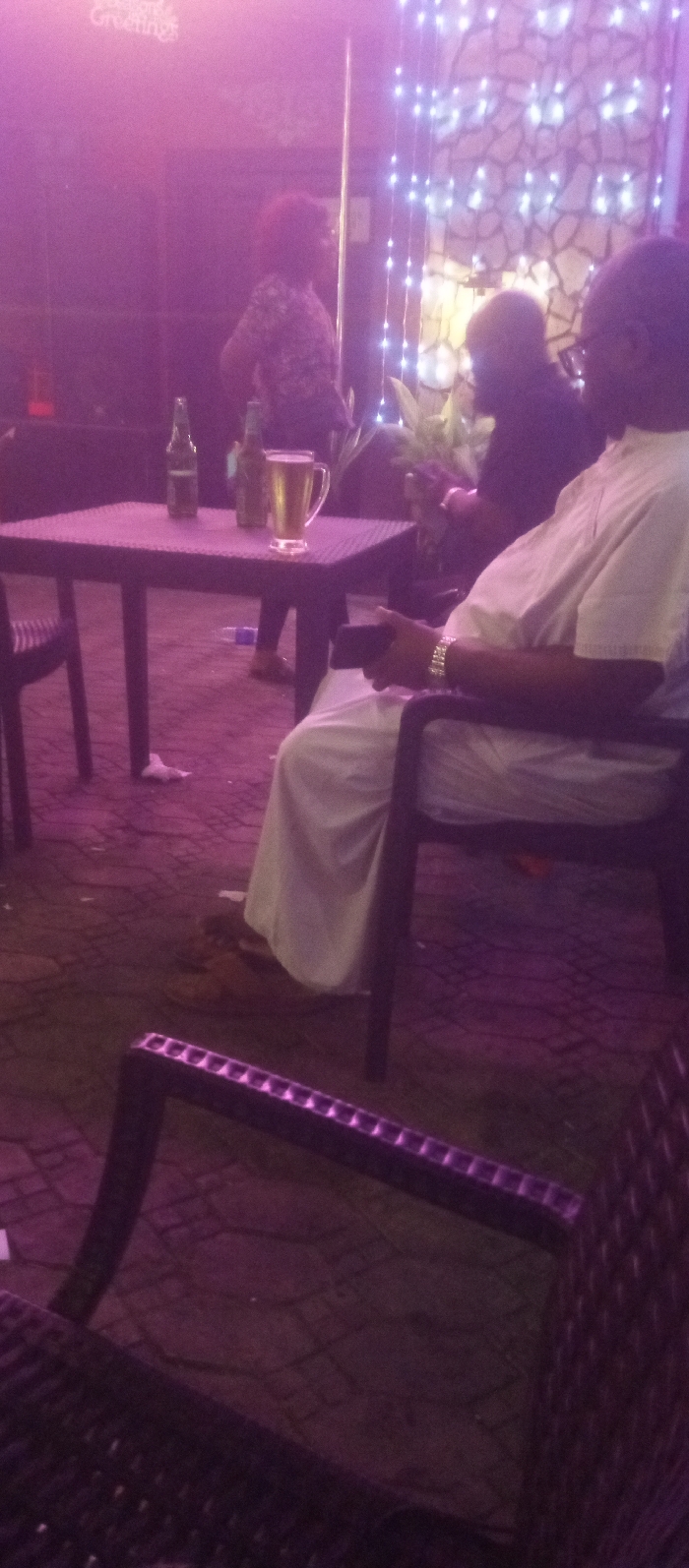 Outdoor patio scene with people seated at tables. Two glass bottles and a beer mug sit on one table. A person in a white garment is seated, holding a phone. Another individual stands in the background, wearing a patterned top. String lights hang against a textured wall. The lighting is predominantly purple.