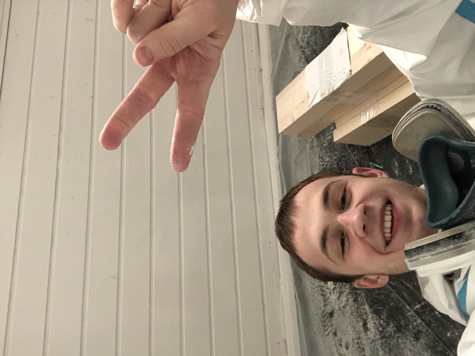 An indoor scene in Starokorsunskaya, Russia, depicts a young adult male with short brown hair, wearing a white protective suit and smiling directly at the camera. A respirator mask with dual grey filter cartridges hangs around his neck. In the upper right quadrant, a second individual's right hand extends in a 'peace' or 'victory' gesture, with white residue visible on the fingertips. To the right of the smiling male, a stack of light-colored wooden planks or beams rests on a dark, stained protective floor covering. A white paper or label is affixed to the top plank. The background consists of a white, horizontally paneled wall. The environment suggests an active construction, renovation, or painting site.