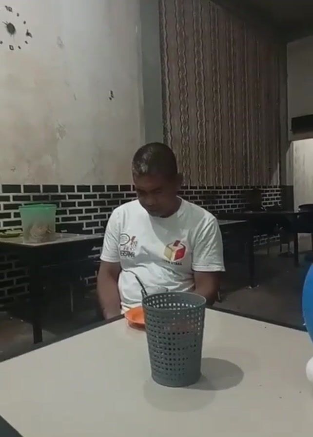 A man is sitting alone at a table in a sparsely furnished room. He is wearing a white t-shirt with writing and a logo. A small orange saucer with a glass and a spoon is in front of him. There is a gray, basket-weave textured holder on the table. The walls are a dull white with a black and white patterned stripe near the floor. In the background, there are dark tables and chairs, a striped curtain, and a doorway. There is a clock on the wall. The man is looking down at the objects on the table. The lighting is dim and the overall mood is subdued.