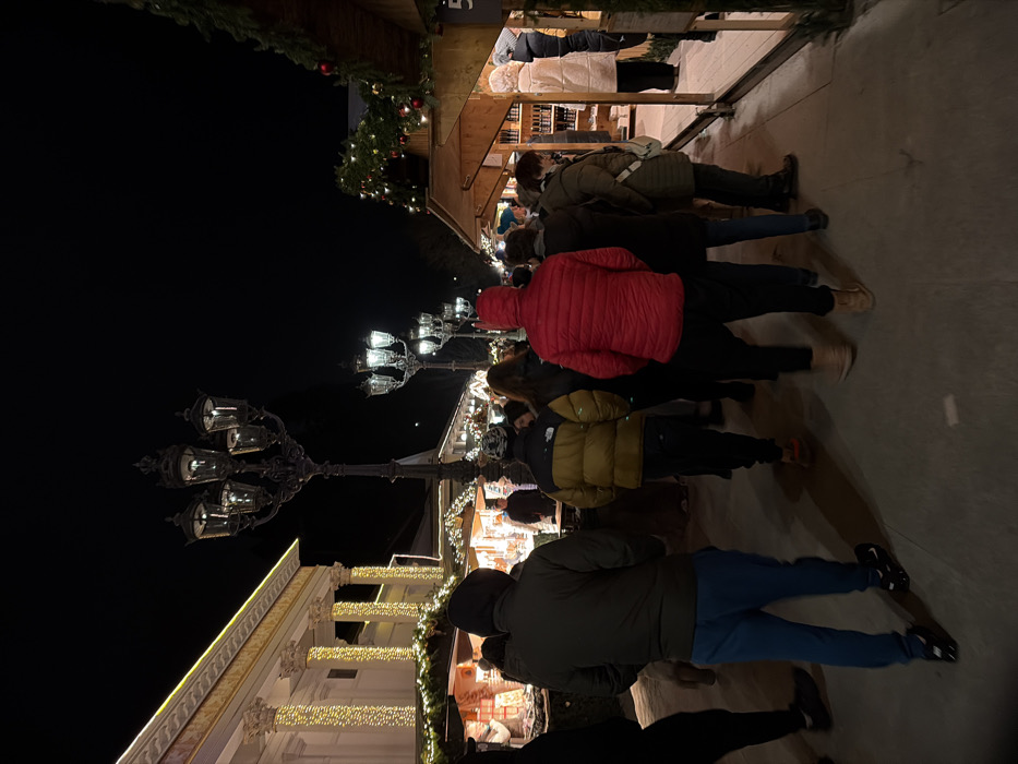 A nighttime scene of a crowded outdoor market. People browse stalls decorated with lights and garlands. Tall, ornate lampposts illuminate the area. A white building with decorative columns and lights stands near the market. The dark sky suggests it is evening or night, with the stalls and lights being the primary sources of illumination.