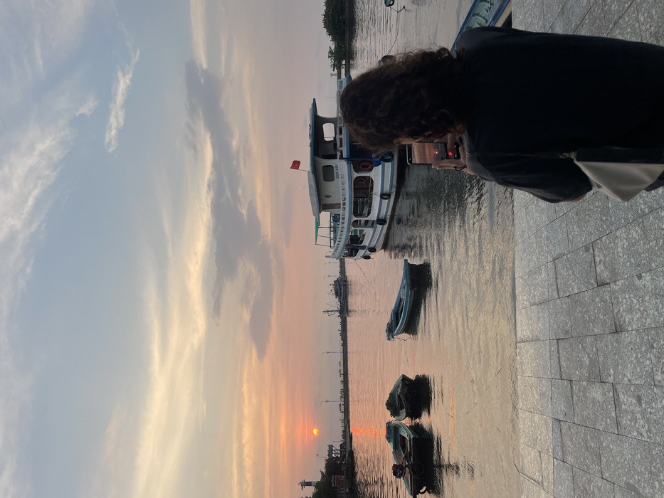 The image depicts a sunset over a harbor in Phú Quốc, Vietnam. In the foreground, a person with dark, curly hair, viewed from the back, stands on a grey tiled walkway. They are wearing a dark top and holding a smartphone horizontally, actively photographing the setting sun. A light-colored shoulder bag is visible on their left side. The calm water directly in front of the walkway reflects the warm orange and pink hues of the sunset. Three small, unoccupied boats are present on the water: two dark, possibly wooden, vessels are grouped on the left, and a single light blue boat is positioned to the right. A larger, white and blue multi-decked boat with "SG-00160" visible on its stern is moored to the right, flying a red Vietnamese flag from its upper deck. On the horizon to the left, the sun, a vivid orange orb, is low, partially obscured by a structure. A long pier or promenade extends across the mid-distance horizon, populated by numerous indistinct figures. A blue and white lighthouse-like structure is visible on the far left of the pier, near the setting sun. Several streetlights are spaced along the promenade. The sky transitions from a luminous orange and pink near the horizon to a pale blue overhead, with scattered light clouds. Distant ships are faintly visible in the background harbor area.