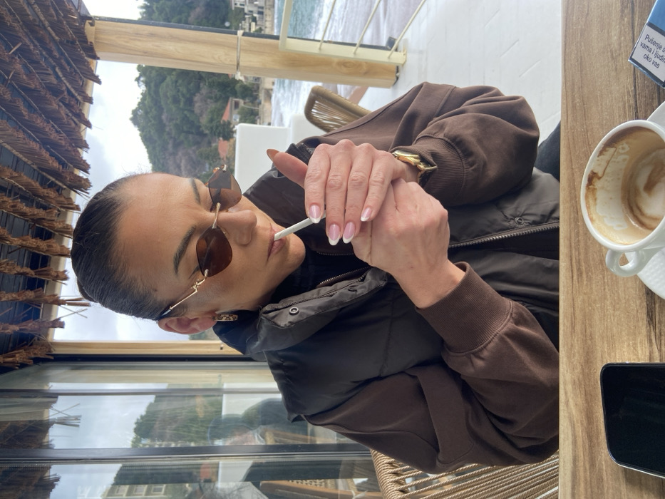 A woman is depicted seated at a light wooden table on an outdoor patio in Petrovac centar, Montenegro, near the coastline. She is actively lighting a cigarette held between her lips with a metallic lighter held in her cupped hands. Her nails are manicured with white tips. She wears dark brown oval sunglasses, a dark brown puffer vest over a long-sleeved dark brown top, and a gold-toned watch on her left wrist. Her dark hair is pulled back, and she has a patterned earring in her left ear. On the table in front of her is a white ceramic cup with residual coffee or espresso, a dark smartphone, and a blue and white cigarette pack. The immediate environment includes a woven chair on her right, a thatched overhead structure, and clear glass panels or windows behind her. Beyond the patio, the Adriatic Sea is visible with light waves, a sandy or pebbled beach, and buildings along the shore. Green, treed hills rise in the distant background under an overcast sky.