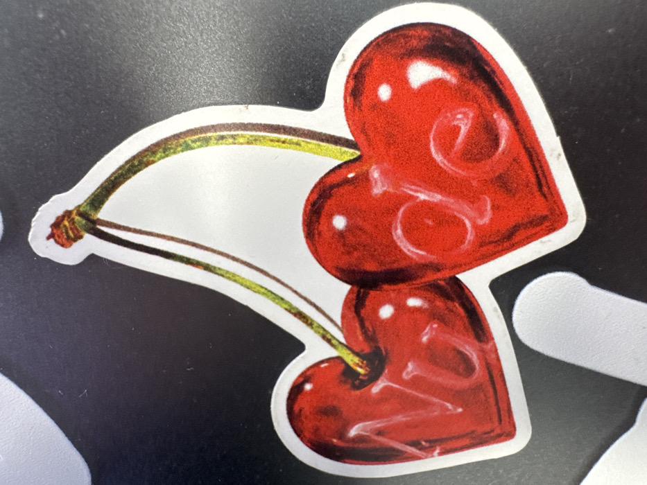 The image displays a sticker affixed to a dark, non-reflective surface in San Bernardino Tlaxcalancingo, Mexico. The sticker features two glossy red shapes resembling hearts, positioned side-by-side, connected by a curved green and brown stem extending upwards. The word "Nude" is embossed or printed in a stylized fashion across the two heart-shapes, with "Nu" visible on the left and "de" on the right. The sticker is cut along its outline, creating a white border around the central design. Portions of other white, irregularly shaped objects or stickers are visible in the upper left and lower left corners of the frame.