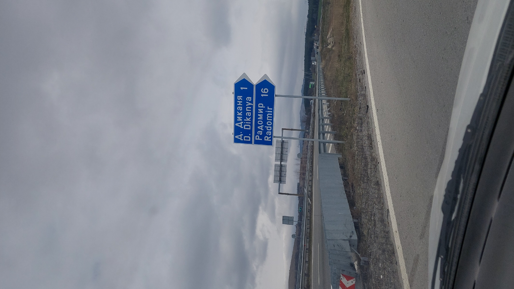 The image depicts an asphalt highway segment in Bulgaria, specifically near Dolna Dikanya. The scene is observed from within a vehicle, with the top of a dark dashboard and a windshield wiper visible in the immediate foreground. The sky is uniformly overcast, presenting a grey backdrop. To the right of the vehicle's path, a blue highway sign stands on two metal poles. The sign has two panels: the upper panel reads "Д. Диканя D. Dikanya 1" with a left-pointing arrow, indicating that Dolna Dikanya is 1 kilometer away in that direction. The lower panel reads "Радомир Radomir 16" with a right-pointing arrow, indicating Radomir is 16 kilometers away. This places the viewpoint near the turn-off for Dolna Dikanya. The ground adjacent to the right side of the road is covered in dry, light brown vegetation and sparse soil. In the distance to the right, a line of trees and low hills are visible. To the left of the vehicle, a grey metal guardrail with a red and white chevron marking is present. Beyond this guardrail, another highway lane is visible, running parallel. Further left, several metal structures resembling gantries or overhead sign supports are situated, along with smaller road signs. The overall environment suggests an open, non-urban landscape with modern highway infrastructure under a cloudy autumn or winter sky. No people are visible. Vehicles are discernible in the distance on both highway sections.