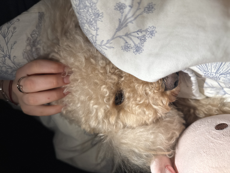 The scene is set indoors, likely within a residential dwelling in Pleven, Bulgaria; however, no specific geographic identifiers for the exact location within the city are discernable from the image. The primary subjects are a light-brown, curly-haired dog and a human hand. The dog, possibly a poodle, is positioned centrally, with its head and upper body visible. Its fur is dense and tightly curled. The dog's right eye is partially open, and its dark nose is prominent. A white fabric with a repeating light blue floral pattern (depicting small flowers and stems) covers a portion of the dog, suggesting bedding. To the left of the dog's head, a section of a light pink plush toy, featuring a small dark circular detail, is visible. A human hand, with fair skin and manicured nails, rests on the dog's head. A silver-colored ring with a distinct central element is present on the ring finger of the human hand, and a thin red string-like bracelet is visible on the wrist. The background is dark and out of focus, consistent with an interior setting under potentially subdued lighting. The interaction involves the human hand gently touching the dog's head, indicating petting or comforting.