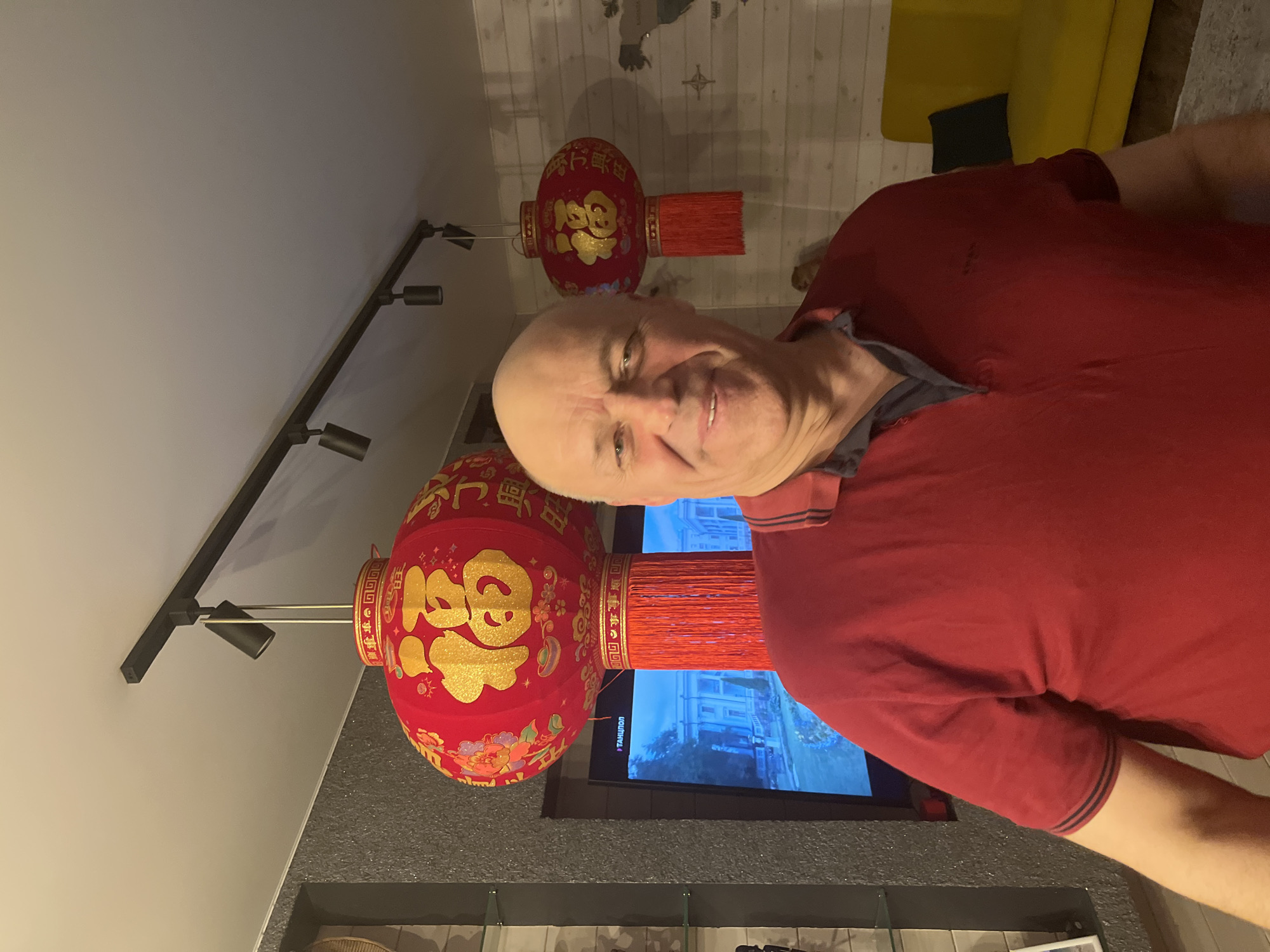 A man in a red polo shirt is standing indoors near two red Chinese lanterns
