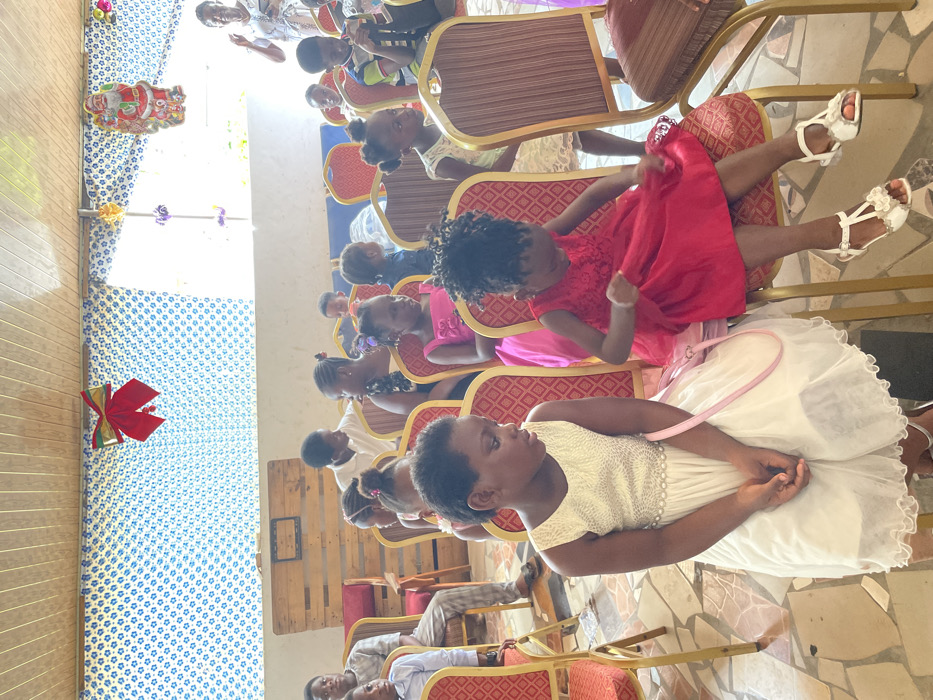 This image captures an indoor gathering of approximately twenty individuals, primarily children, seated on rows of red and gold upholstered chairs in a room located in Accra, Ghana