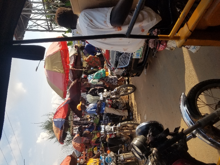 The image depicts a bustling outdoor market scene in Egbagu, Nigeria, during daylight hours under a sky with scattered white clouds