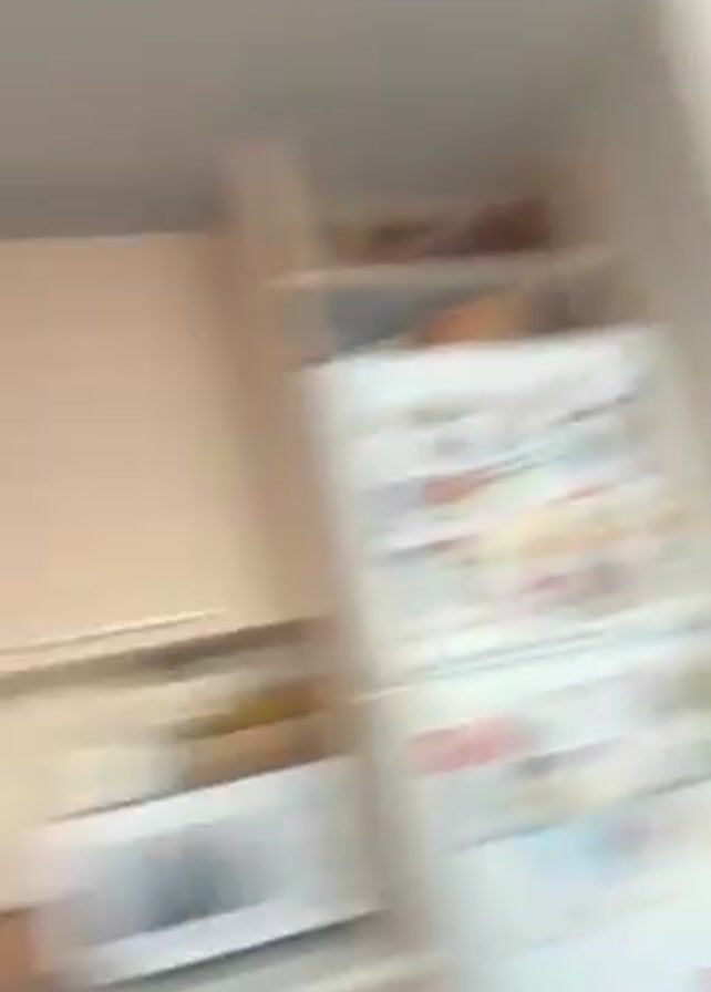 A woman is recording a selfie video in what appears to be her apartment. Initially, she is making a kissing face towards the camera. The camera then moves, showing a second woman in a red shirt in the background, near kitchen cabinets. The camera moves again, and the first woman is back in frame, making a grimacing face with her eyes squinted shut. The setting includes a white cabinet with a plant, a tan bag hanging off of it, and an air conditioning unit visible on the wall near the ceiling. Audio includes background music.