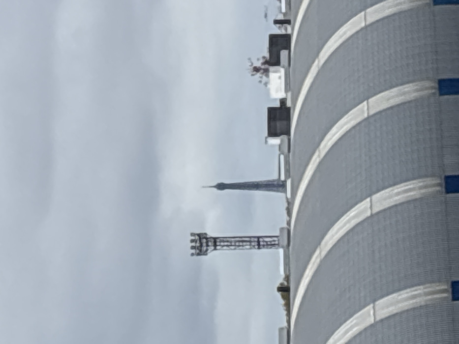 The image displays an urban panoramic view under an overcast, grey sky in Paris, France. In the foreground, the expansive, curved grey roof of a building dominates the lower half of the frame, featuring distinct parallel light-colored seams that trace its arc. A dark blue border is visible along the roof's lowest visible edge. Above the roofline, the distant urban skyline presents several structures. To the left, a tall, dark metal lattice tower with a square, multi-component top rises prominently. To its right, the upper section of the Eiffel Tower is clearly visible, identifiable by its characteristic tapering silhouette and pointed spire. Further right along the horizon, several dark, rectangular rooftop structures are discernible, alongside a cluster of reddish-brown elements, possibly vegetation or antennas. No individuals, actions, or interactions are present in the scene.