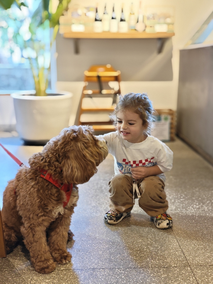 This image, captured in Mumbai, India, depicts a young child interacting with a dog indoors. A light-skinned child, estimated to be a toddler or preschooler, with curly light brown hair, is crouched down, smiling, and gently touching the head of a medium-sized, curly light brown dog with their right hand. The child is wearing a white short-sleeved t-shirt featuring a red and white checkered graphic, light brown corduroy pants with a drawstring, and multi-colored Crocs-style shoes. The dog, which appears to be a Poodle mix, wears a red harness with a red leash extending out of frame to the left, and is seated, looking up at the child. In the background on the left, a large white planter contains a tall green plant. On the rear wall, a light brown wooden shelf holds several bottles and small objects. Below the shelf, a wooden high chair or step stool is positioned. The floor is a light gray terrazzo or speckled concrete. The setting appears to be a brightly lit, clean indoor commercial space.