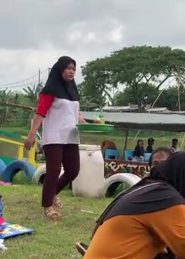 The scene unfolds on a grassy area near a river or large body of water under a cloudy sky. A woman wearing a white shirt, maroon pants, and a black hijab walks towards the camera, carrying a tray of food and beverages. In the background, a boat with a canopy is occupied by several individuals. The boat is decorated with painted tires. People are seated on the grass, some wearing hijabs. A bridge is visible in the background, and an Indonesian flag is flying near the boat. The overall atmosphere appears to be that of a picnic or outdoor gathering by the water.