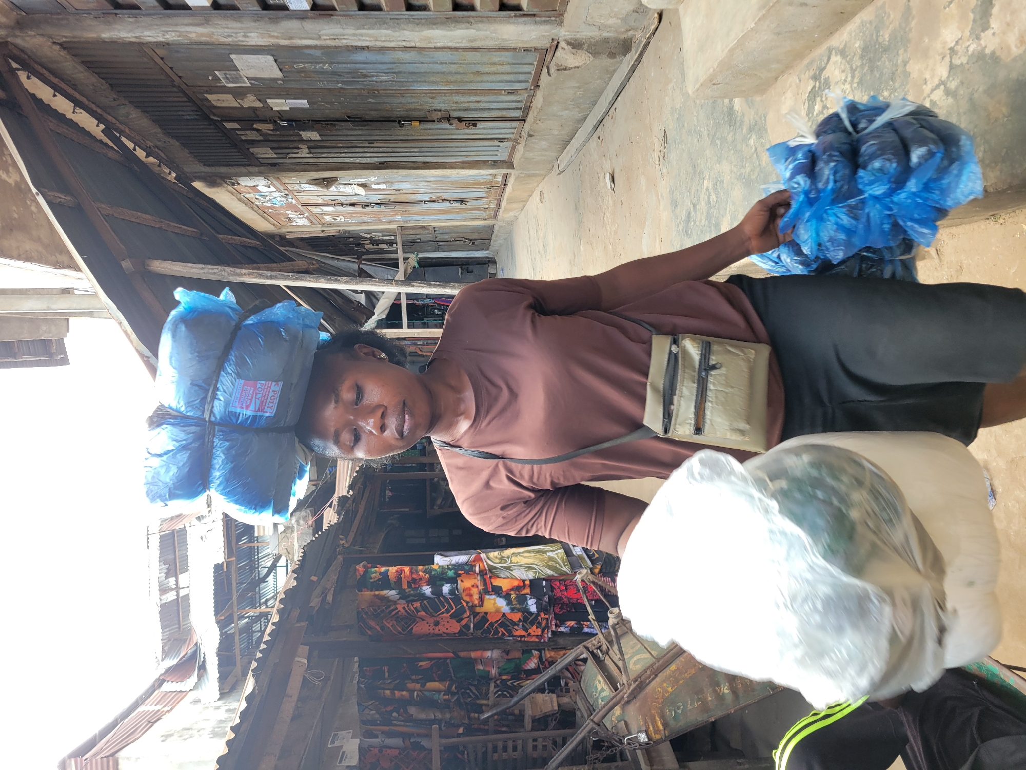 A young adult female is walking forward on a packed dirt and concrete thoroughfare within a market area in Onitsha, Nigeria. She has a dark complexion and dark hair pulled back. She wears a short-sleeved brown t-shirt, dark shorts, and a light brown sling bag. On her head, she balances three rectangular bundles wrapped in blue plastic, secured with rope; the bottom bundle bears the visible text "POLY." In her left hand, she carries a large object wrapped in clear plastic. In her right hand, she holds a cluster of smaller bundles, also wrapped in blue plastic. To her left are open-fronted market stalls with wooden frames and corrugated metal roofs, displaying multiple brightly patterned fabrics. An old, metal-framed cart with a padlock is partially visible near these stalls. To her right, a row of buildings features closed corrugated metal doors, each secured with multiple padlocks, and light-colored walls. An overhead lean-to structure of wood and corrugated metal provides shade over the thoroughfare.