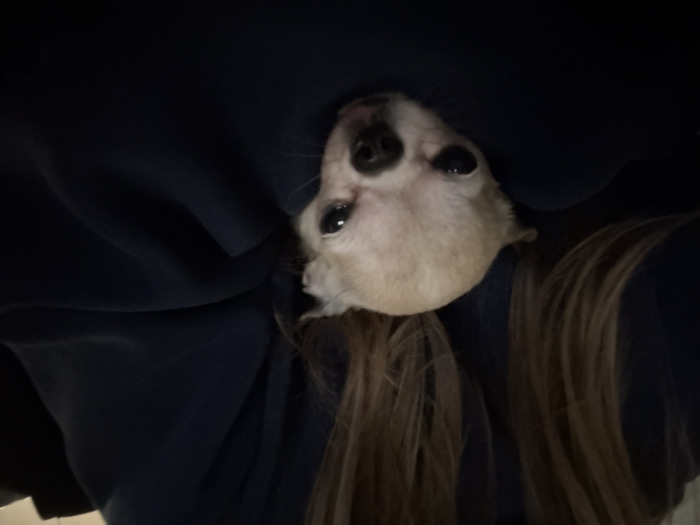The image depicts a small, light-colored canine, consistent with a Chihuahua breed, with cream-colored fur, prominent dark eyes, and a dark snout. The animal's head is visible, positioned within the folds of a dark blue garment, likely a hooded sweatshirt or similar apparel. Above and partially to the left of the animal, a portion of an individual's long, brown hair is discernible, indicating the garment is being worn by a person. The individual's face or other body parts are not visible. The environment appears to be an indoor setting with subdued lighting, lacking any discernible background elements or specific architectural features. The precise location within the city of Plovdiv, Bulgaria, cannot be determined from the visual information presented.