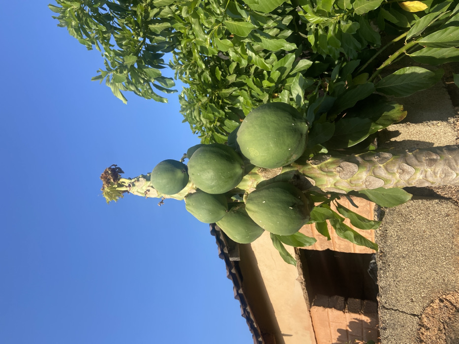 - "A papaya tree trunk laden with six green, unripe fruits grows against a clear blue sky, partially obscured by lush green foliage" by FM-UuJob2, licensed under CC BY 4.0