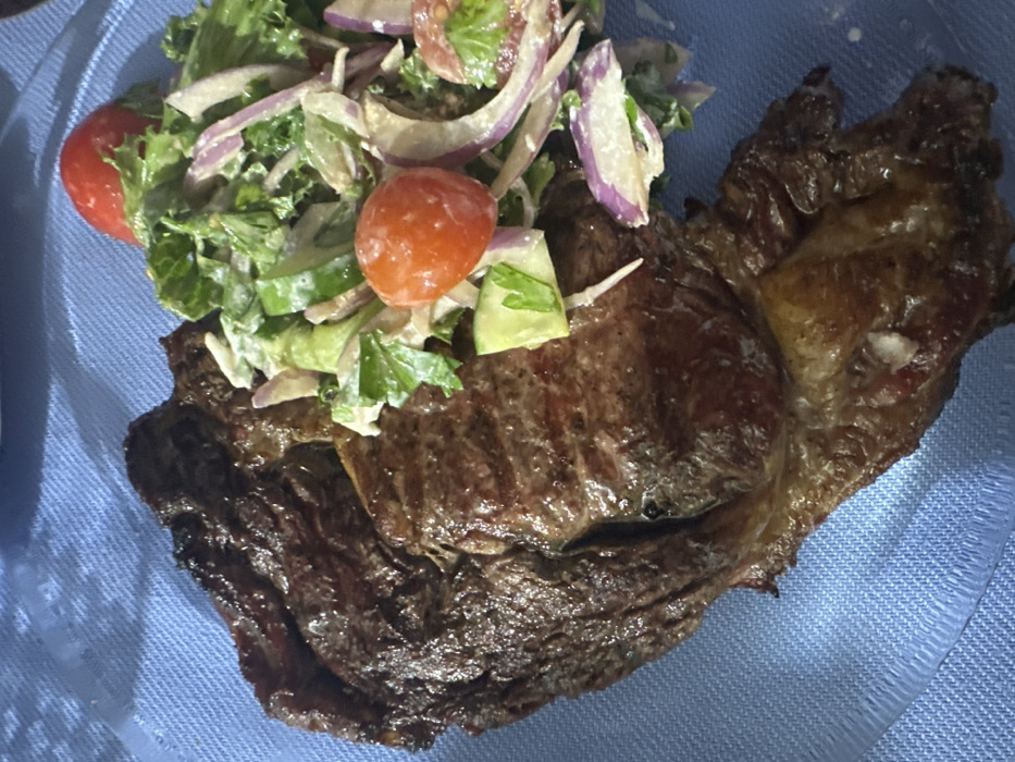 - "The image displays a single serving of grilled steak and a side salad, presented on a blue, textured plate" by FM-F8CIG2, licensed under CC BY 4.0