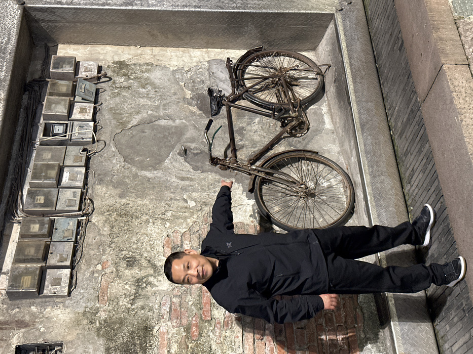 An adult male stands outdoors against a weathered wall in Shangcheng District, China. The man, of East Asian descent, wears a black long-sleeved jacket, black trousers, and black athletic shoes with white soles. He is positioned on the left side of the frame, facing slightly right and extending his right arm with his index finger pointing horizontally towards a vintage, heavily rusted bicycle mounted vertically on the wall. The bicycle displays a black spring-loaded saddle, full fenders, and a rear rack, with faint green handlebar grips. The wall behind the man and bicycle is an aged surface featuring exposed red brick on the left and peeling, textured grey plaster on the right, with visible areas of discoloration. A row of approximately twelve grey electrical meters or fuse boxes, connected by visible wiring, is mounted high on the wall above the bicycle. The ground comprises a patterned metal kick plate at the base of the wall, transitioning to dark grey grooved paving slabs and a raised concrete step in the foreground. The scene is illuminated by strong sunlight from the upper left, casting defined shadows.