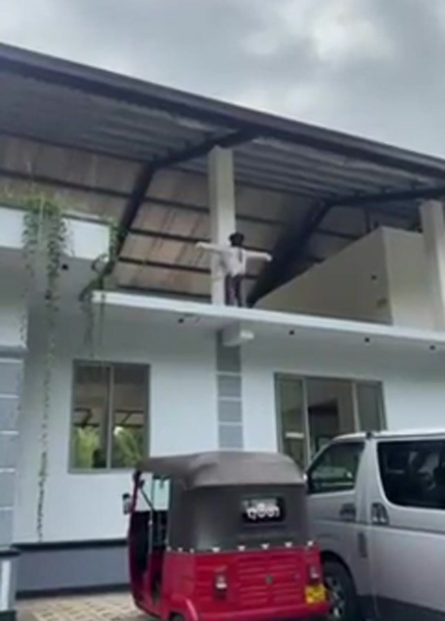 building exterior with a mannequin standing on a ledge on the second floor. The mannequin is dressed in a light-colored, button-down shirt and dark pants with a tie. Its face is dark, with what appears to be a dark mask or paint. The mannequin is posed with its arms outstretched in a "T" shape. A red auto-rickshaw (tuk-tuk) and a silver minivan are parked in front of the building. The sky is overcast.