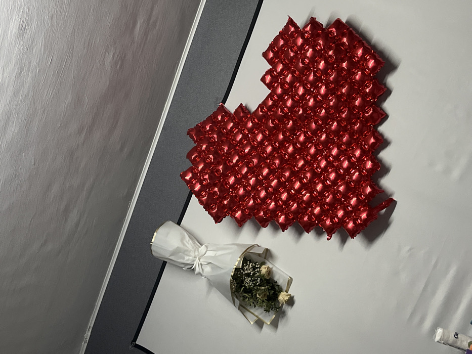 This image, captured in Sofia, Bulgaria, displays an indoor wall arrangement. A large, two-dimensional heart-shaped decoration, composed of numerous individual red metallic foil squares arranged in a grid pattern, is prominently affixed to a white vertical surface. To its immediate left, a bouquet of dried light-colored flowers, predominantly small roses and green foliage, is wrapped in white paper with gold trim and tied with a white ribbon, also mounted on the surface. The white surface transitions to a dark grey horizontal band above the display. A textured, light grey ceiling is visible in the upper frame. A partial cylindrical container is present in the lower-left corner of the image.