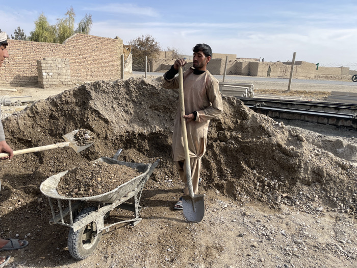 This image captures a manual labor scene at an outdoor site in Nakhonay, Afghanistan, under a clear blue sky