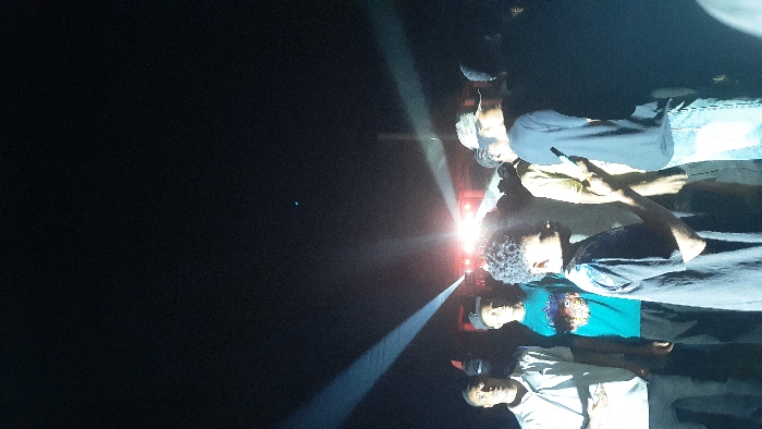A group of five people stand in a line, illuminated by a bright light shining directly towards them. The darkness surrounding them obscures their features, but their clothing is partially visible. The first person is wearing a white shirt, the second a green t-shirt, the third a dark t-shirt, and the fourth a light brown shirt, holding a phone. The last person wears a dark top.