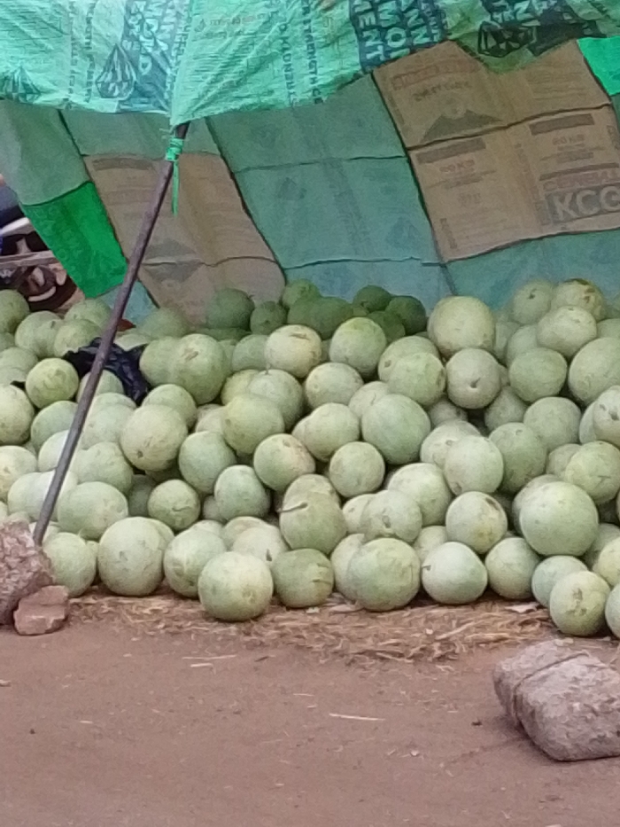 - "A ground-level view in Sabaa, Ghana, displays a large quantity of light green, spherical fruits, consistent with small watermelons or gourds, piled extensively on a reddish-brown, dusty ground partially covered with dry straw" by FM-2KSU42, licensed under CC BY 4.0