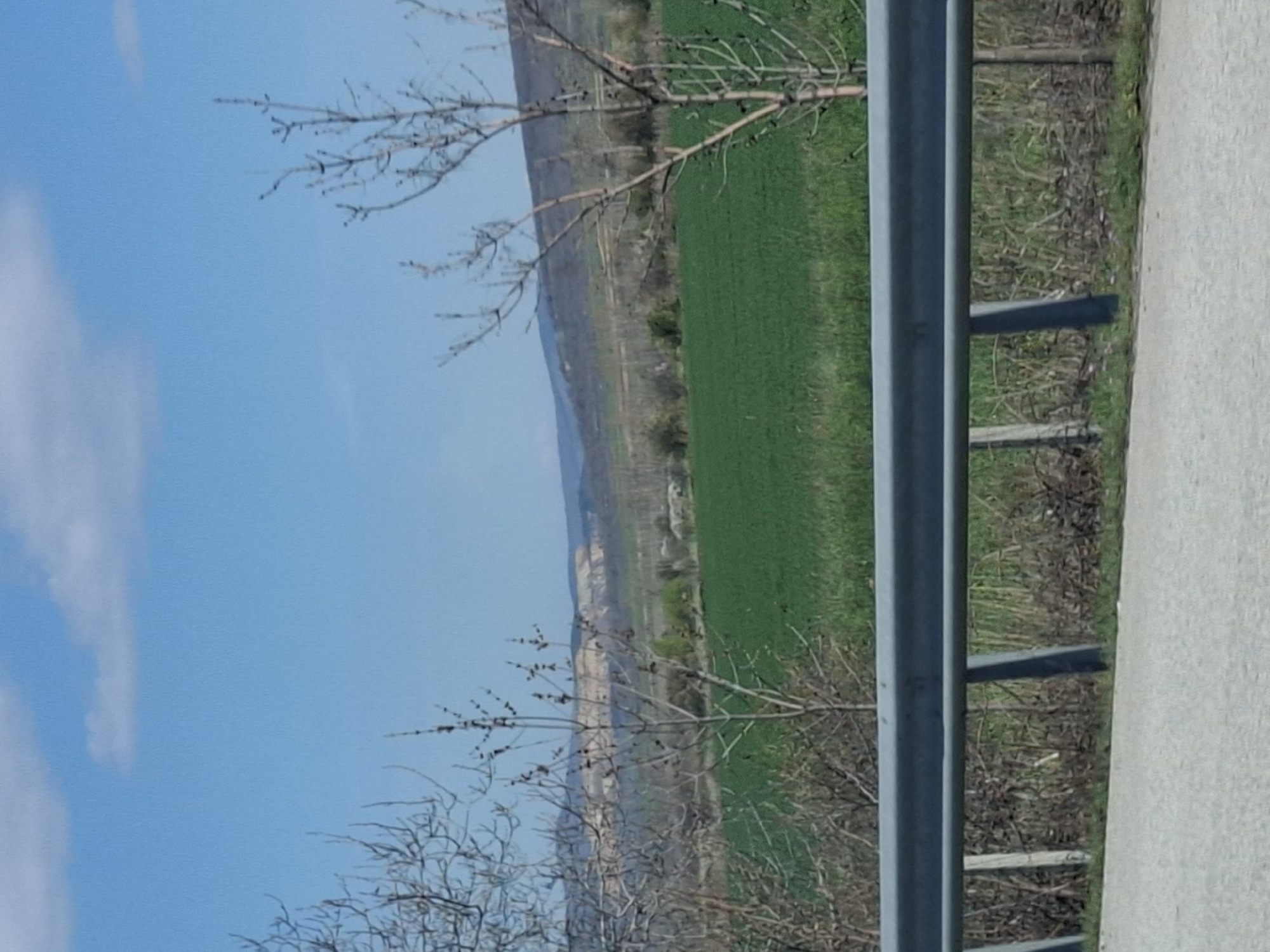 The image depicts a rural roadside scene in Shtarkovo, Bulgaria. A gray metal guardrail runs parallel to an asphalt road. Beyond the guardrail, a field of vibrant green vegetation stretches towards a distant ridge. Bare-branched trees stand between the viewer and the field. A blue sky with a few white clouds forms the backdrop.