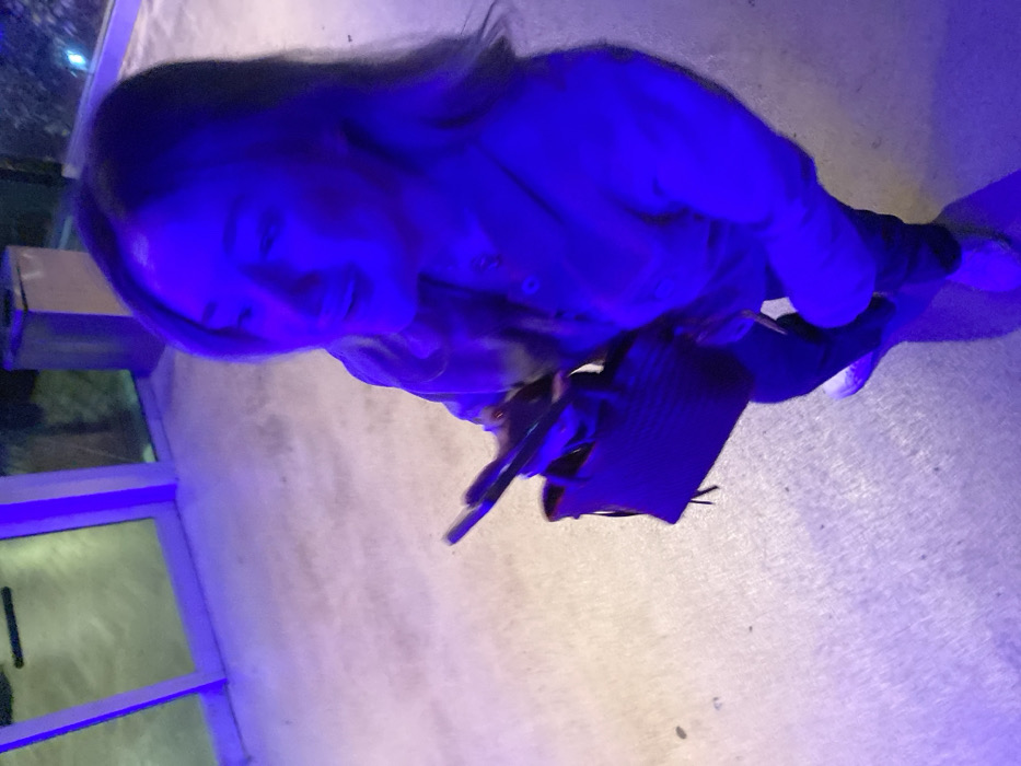 A woman stands on a concrete surface under blue lighting. She has long hair and is wearing a jacket or shirt. She carries a black bag in her left hand. Her face is visible, and she appears to be smiling. The background includes a window with a reflection of outdoor scenery. The image is taken from a high angle, giving a top-down perspective.