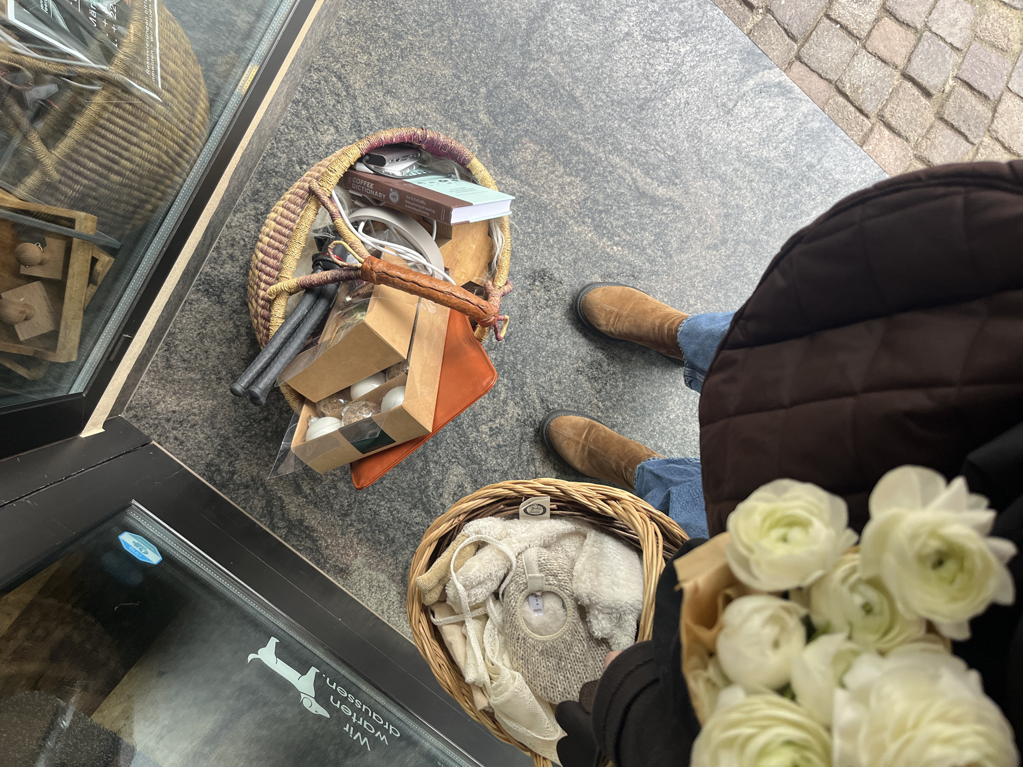 An overhead, first-person perspective photograph depicts a person standing on a light gray speckled pavement outside a storefront in Meisenheim, Germany. The individual wears a dark brown quilted jacket, blue denim jeans, and brown suede ankle boots. They are holding a bouquet of white ranunculus flowers wrapped in brown paper, partially visible on the left. To their immediate left, a natural wicker basket contains cream and white soft textile items, including a knitted sweater. Further away, centered in front of the storefront, a larger, multi-colored woven basket rests on the pavement. This second basket contains an orange-red fabric lining and various items, including small cardboard boxes, cylindrical dark objects (possibly golf club handles), and a book titled "COFFEE DICTIONARY." The dark-framed storefront window displays reflections of baskets and wooden items inside, along with a white dog silhouette and the German text "Wir warten draussen." (We wait outside.). A blue "Ring" sticker is affixed to the window. Reflections on the window also reveal partial text "JÄR" and "Reservierungen bitte anmelden. Wir freuen uns." (Reservations please register. We look forward to it.), suggesting a café or similar business. The pavement transitions to cobblestones on the lower right.