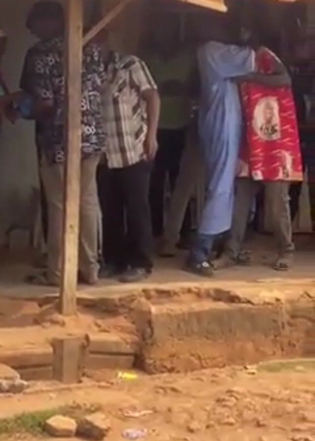 A medium shot captures a group of about ten people gathered under a lean-to structure with a corrugated metal roof. They appear to be engaged in some kind of exchange or interaction, as one woman in a patterned dress and a light blue headscarf is seen handing something in a blue plastic bag to someone in the group. The individuals are dressed in a variety of casual clothing, including patterned shirts, button-down shirts, and traditional robes. The ground in front of the lean-to is dirt and loose stones. The overall atmosphere appears to be informal and communal.
