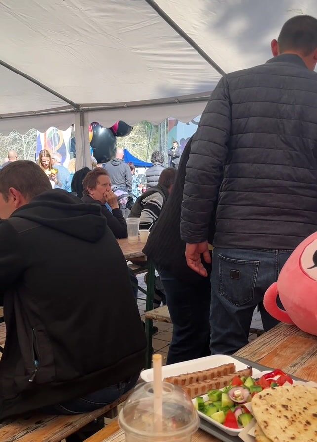 crowd of people sitting at wooden picnic tables underneath a white tent. In the foreground, there is a table with a half-eaten meal consisting of kebabs, salad, and pita bread, as well as a drink in a plastic cup. A pink stuffed animal is resting on the table, out of focus. Several people are sitting or standing at the table, partially obstructing the view. There is a small stage in the background, and an inflatable cartoon character is visible. The overall impression is that the video was taken at an outdoor event.